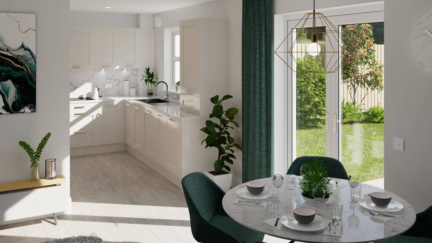 The epitome of chic, semi-rural living, enjoy a spacious open plan kitchen and living area, with plenty of space for dining too. The room is bathed in natural light for a flexible space, with French doors to your own garden perfect for summer gathering and enjoying the fresh air.