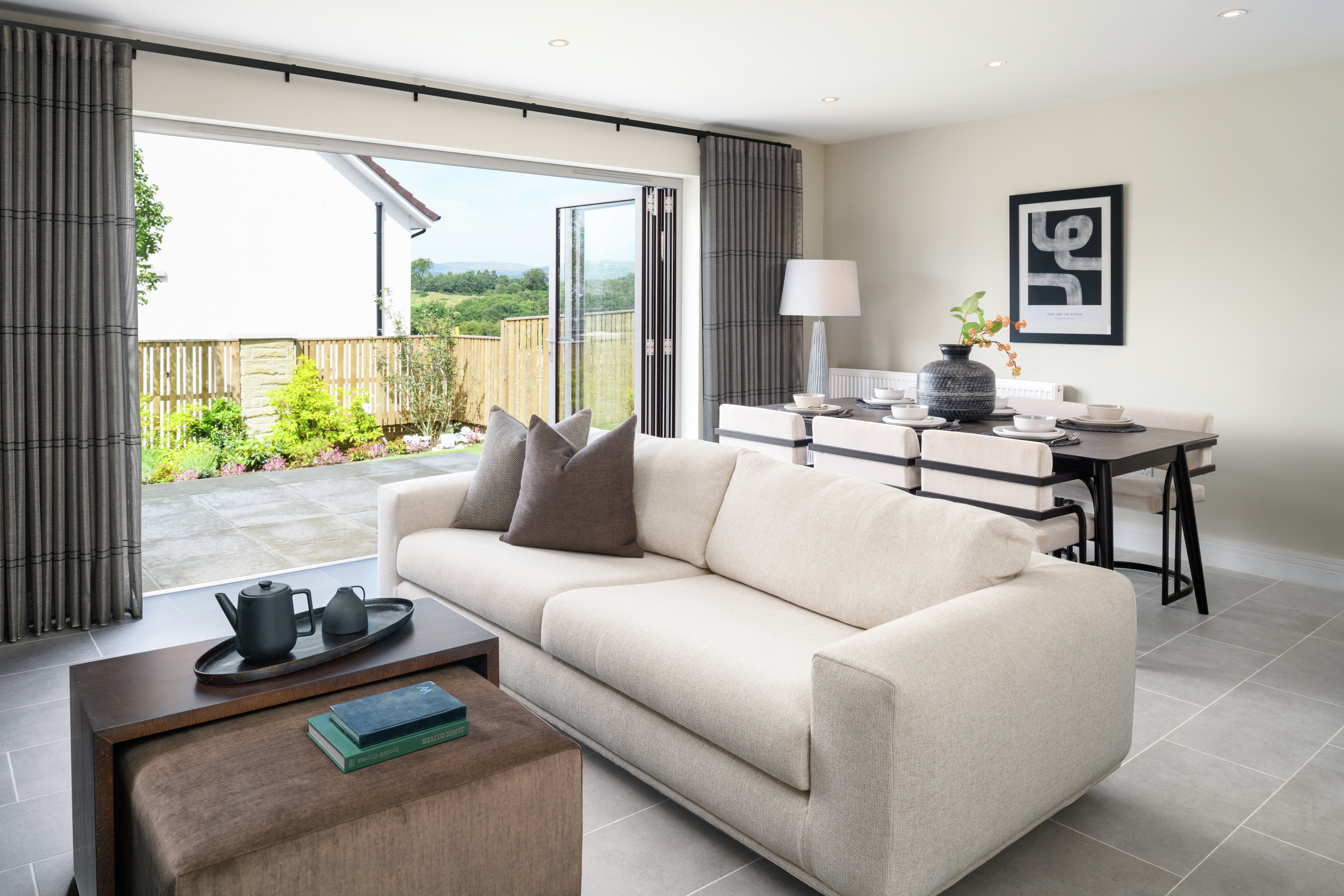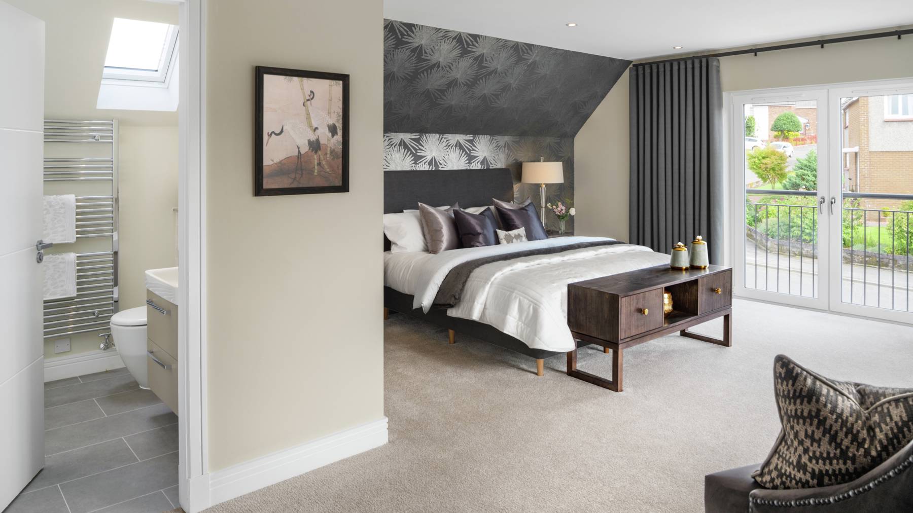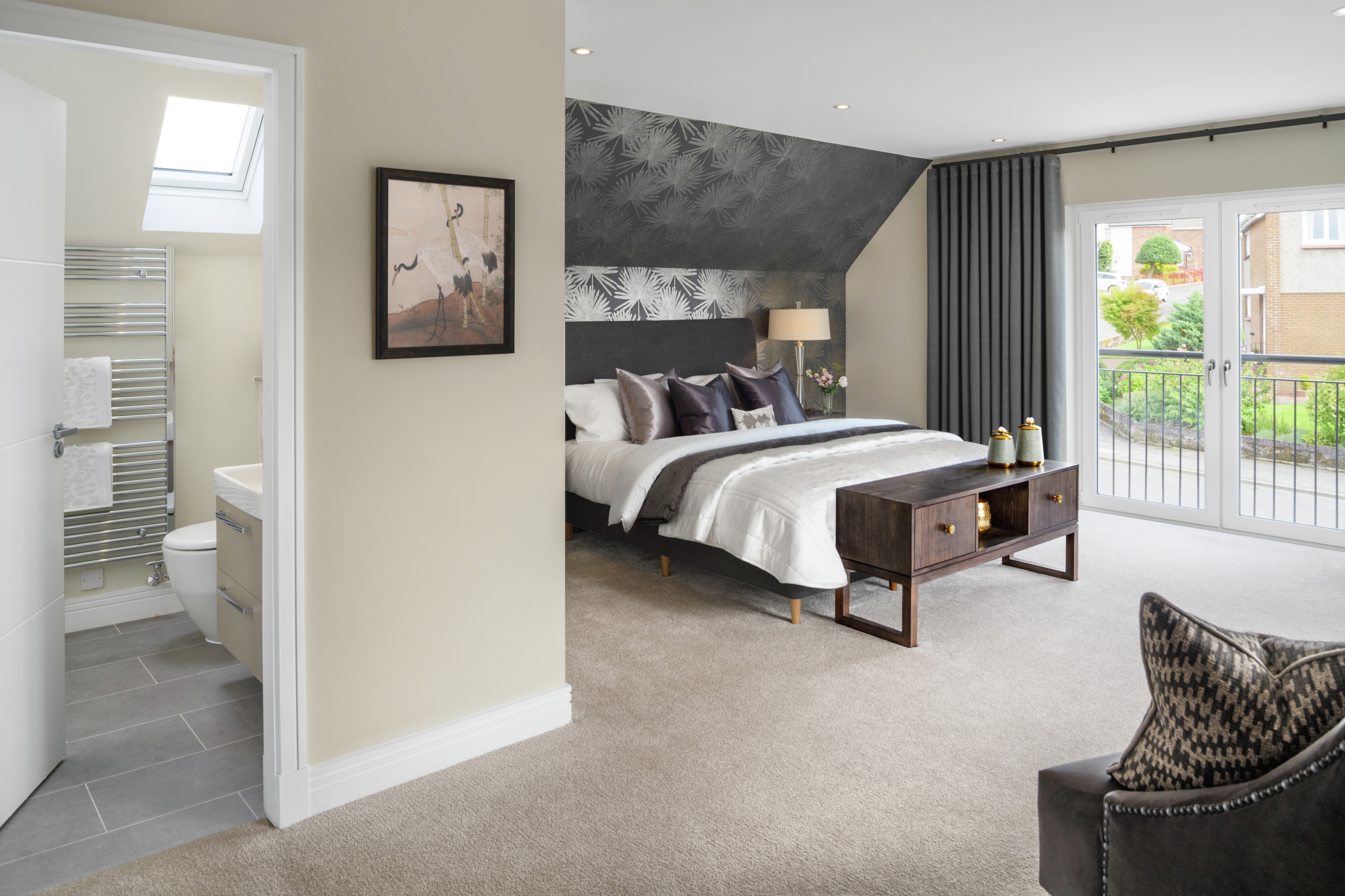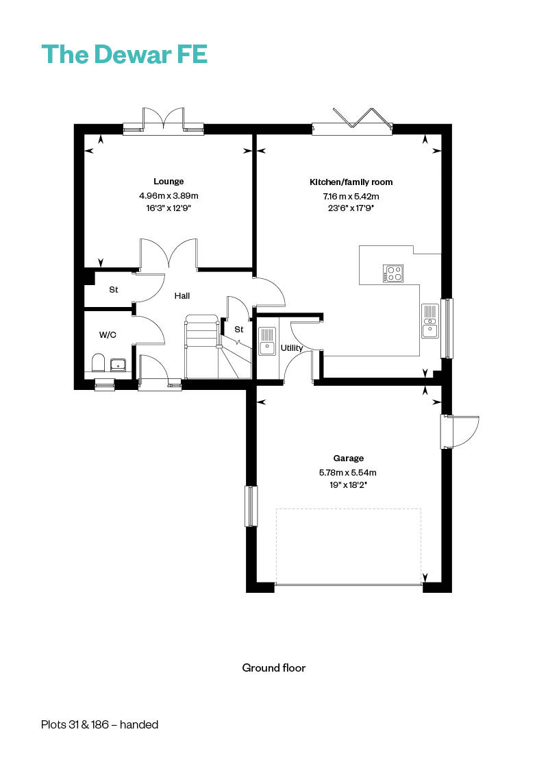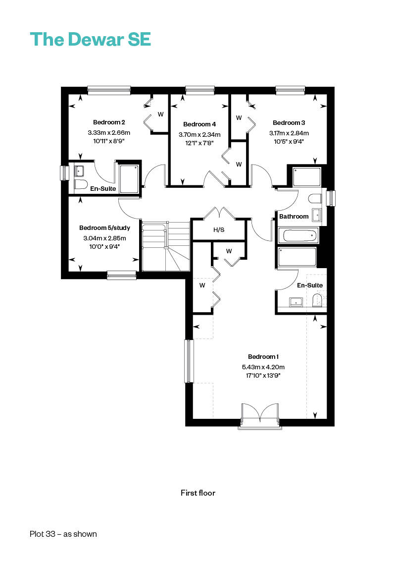 The Dewar is a spacious L-shaped, five-bedroom detached home designed for flexible family living. On the ground floor, a welcoming hallway leads to a formal lounge and an impressive open-plan kitchen, dining, and family room —both opening onto the rear garden via contemporary bi-fold/French doors. The stylish kitchen by Creative Designs features integrated Bosch appliances and peninsula island, perfect for entertaining or informal dining. A utility room, storage spaces, and a WC complete the downstairs.