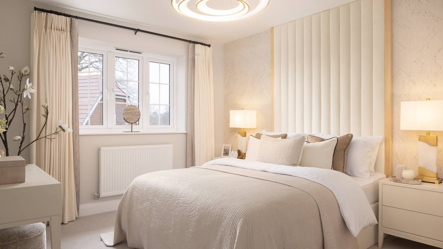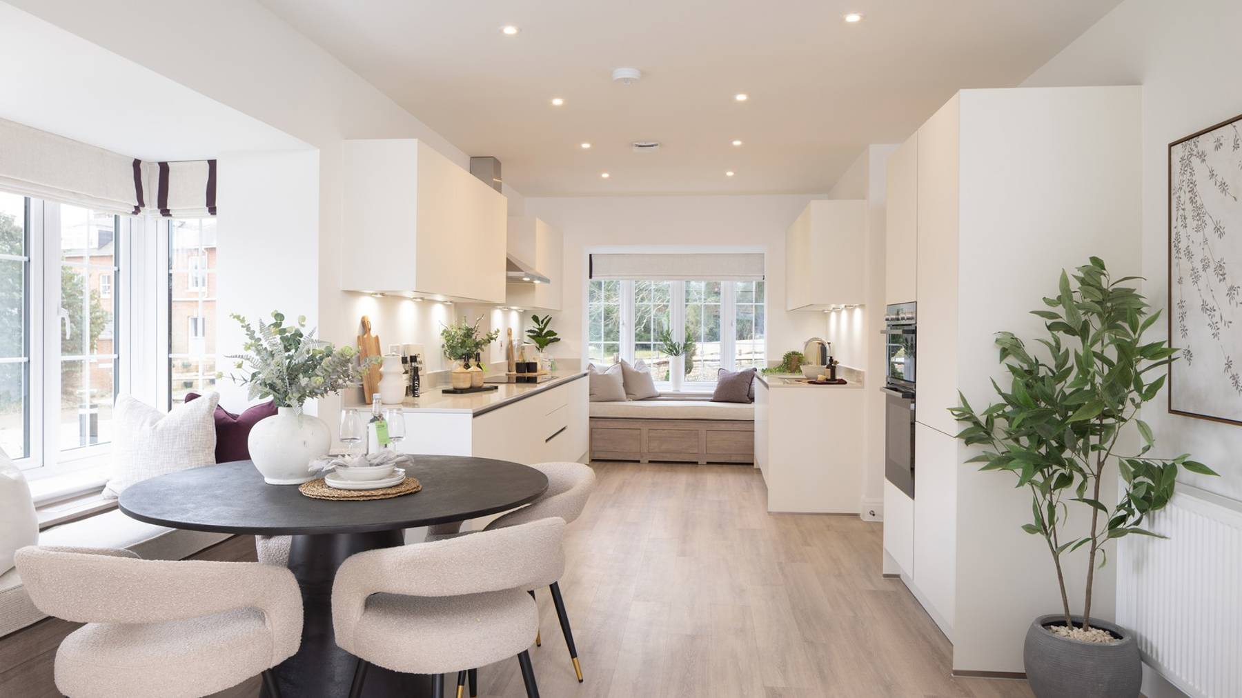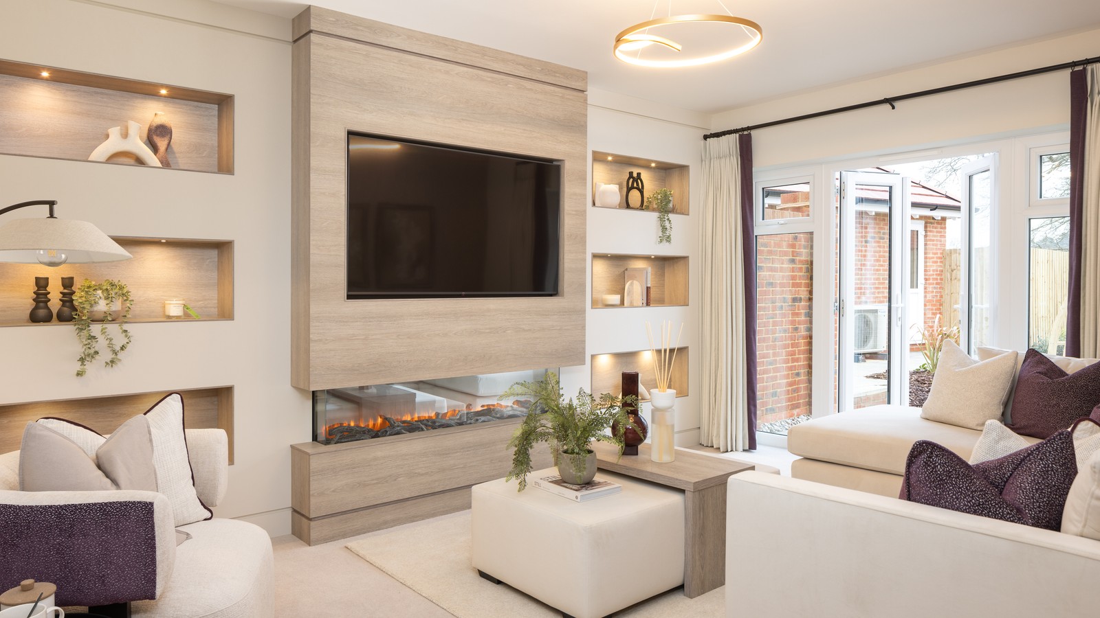 The expansive, triple aspect kitchen/dining/family room is perhaps the most impressive of the downstairs interiors, with integrated Bosch appliances, Amtico flooring and French doors opening out to the garden at the end. On the other side of the hall is the spacious sitting room, also with French doors leading out to the fully-lawned garden, and there is a light-filled, separate study at the front of the home.