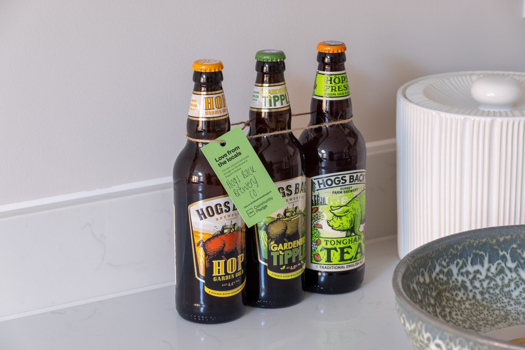 In the kitchen, visitors are greeted with a variety of treats. These include bottled beers from Hogs Back Brewery, roasted coffee beans from Bell’s Beans, and pure raw honey from Little Green Bees, each produced locally and reflecting the flavours of the surrounding Farnham countryside.