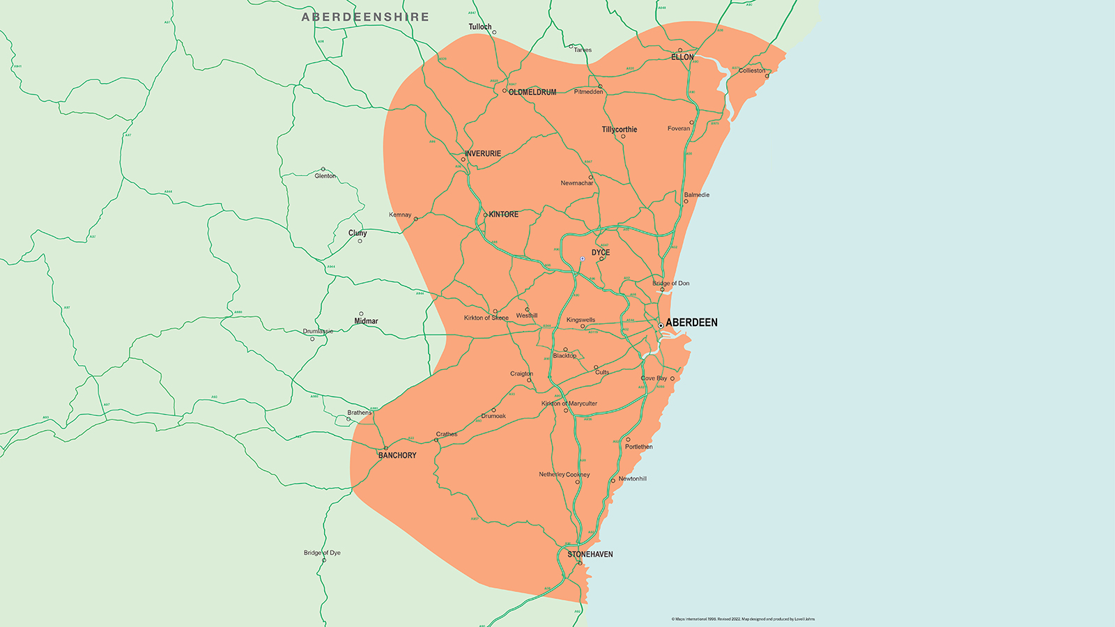 Aberdeen City Centre, Aberdeen City suburbs, Ellon, Newmachar, Inverurie, Kintore, Westhill, Banchory, Portlethen, Newtonhill and Stonehaven.